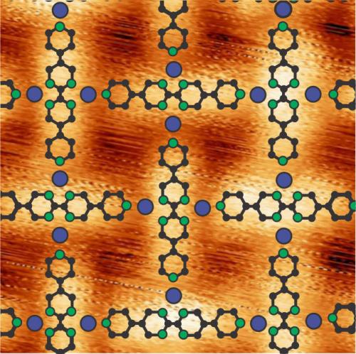 The iron atoms (blue) and the organic molecules (green, black) form a lattice pattern on the gold substrate. Credit: Grumelli et al., Nat. Comm. 2013
