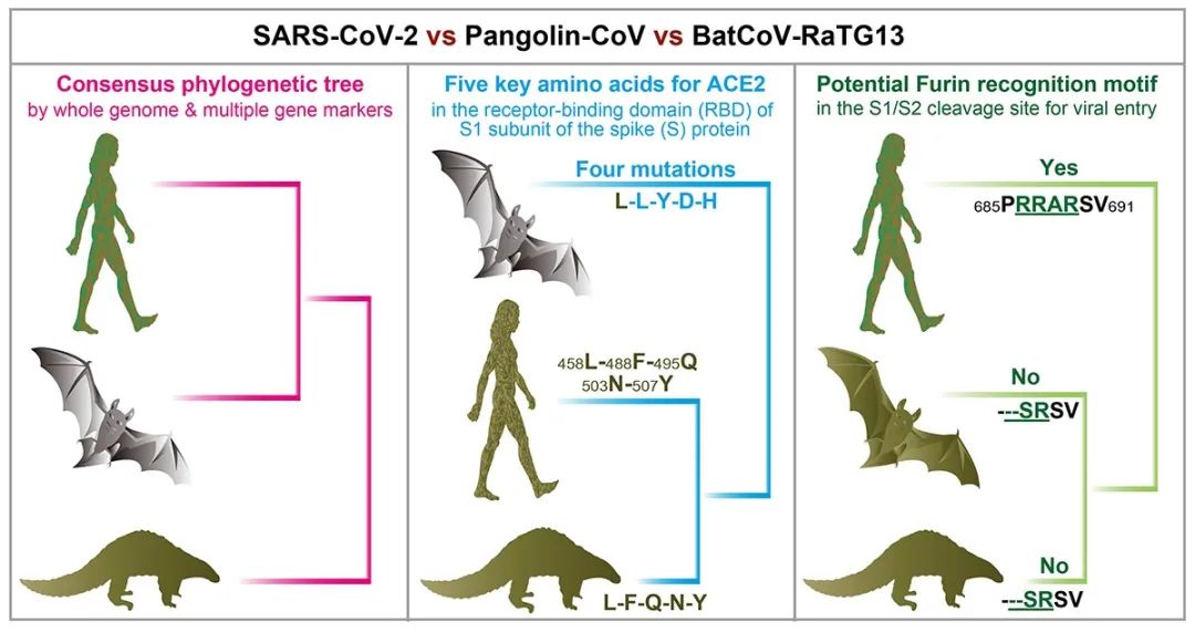 研究發現,穿山甲冠狀病毒與新冠病毒的親緣關系僅次于蝙蝠冠狀病毒,但是穿山甲冠狀病毒與新冠病毒的S1功能基序高度一致,涉及與人類ACE2受體互作的五個關鍵氨基酸殘基完全一致,而蝙蝠冠狀病毒發生了四個突變,提示了穿山甲冠狀病毒與新冠病毒具有相似的宿主細胞識別能力。研究還發現在S1/S2酶切位點,新冠病毒含有中東呼吸綜合征冠狀病毒類似的Furin蛋白識別序列,而穿山甲冠狀病毒、蝙蝠冠狀病毒以及SARS冠狀病毒都缺失了該功能基序,表明新冠病毒與中東呼吸綜合征冠狀病毒具有相似的宿主細胞侵入機制。